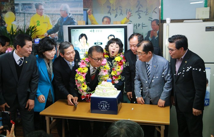 (서울=포커스뉴스) 제20대 국회의원선거일인 13일 민병두 더불어민주당 동대문구을 후보가 당선이 확실시되자 서울 동대문구 자신의 사무소에서 세리머니를 하고 있다. <사진제공=민병두 후보 선거사무소>