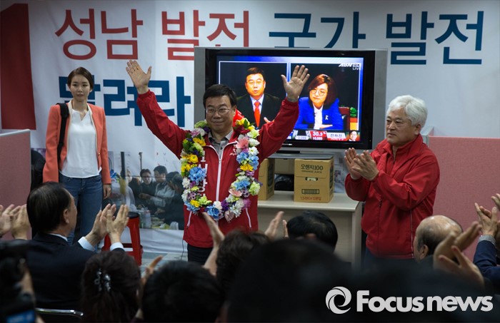 (성남=포커스뉴스) 제20대 국회의원 선거날인 13일 오후 경기도 성남 중원구에 위치한 선거사무실에서 신상진 새누리당 후보가 '당선확실' 이라는 방송사 개표 상황을 확인하고 지지자들의 축하를 받고 있다.