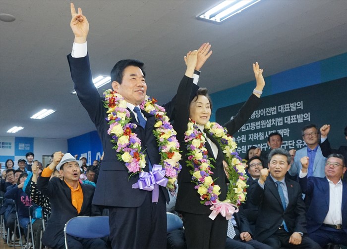 | △ 기뻐하는 김진표 후보 부부 |