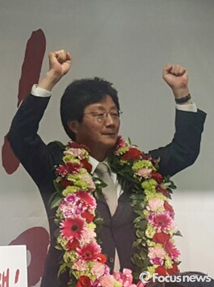 (대구=포커스뉴스) 제20대 국회의원선거 대구 동구을 선거구에서 당선된 무소속 유승민 후보가 13일 오후 대구 동구 선거사무소에서 꽃목걸이를 걸고 주먹을 불끈 쥐고 있다.