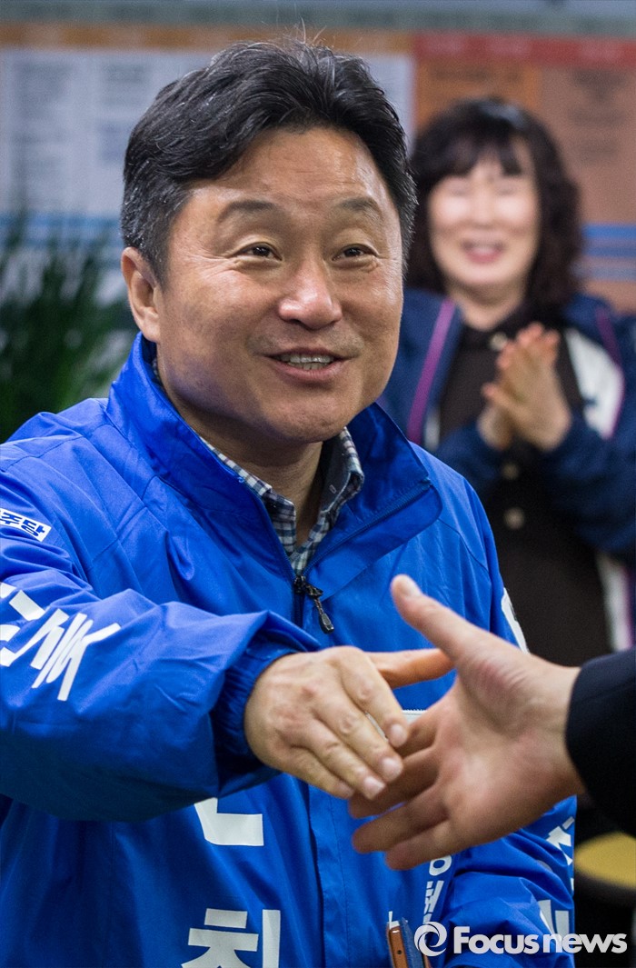(부산=포커스뉴스) 최인호 더불어민주당 부산 사하구갑 후보가 13일 오후 부산 사하구 선거사무소에서 개표방송 결과 시청 도중 앞서고 있다는 소식에 지지자들과 기쁨을 나누고 있다.