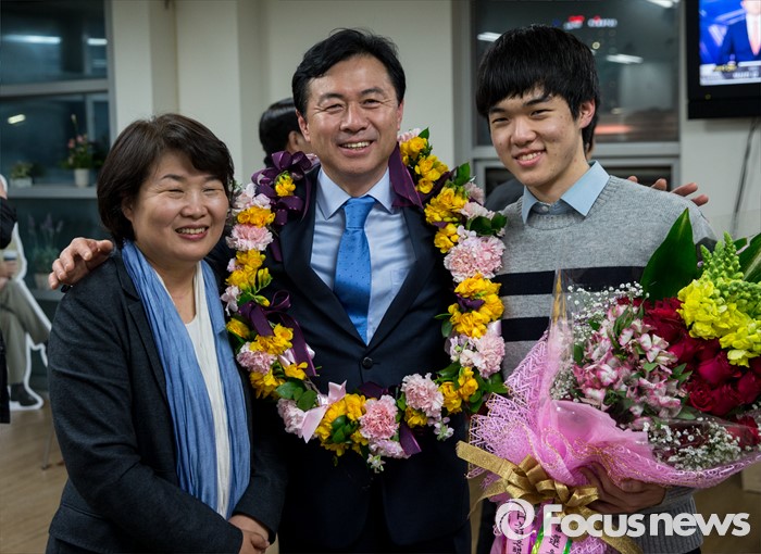 (부산=포커스뉴스) 제20대 국회의원선거에서 당선이 확실시된 전재수 더불어민주당 부산 진구갑 후보가 13일 오후 부산 진구 선거사무소에서 가족과 함께 기념사진을 찍고 있다.