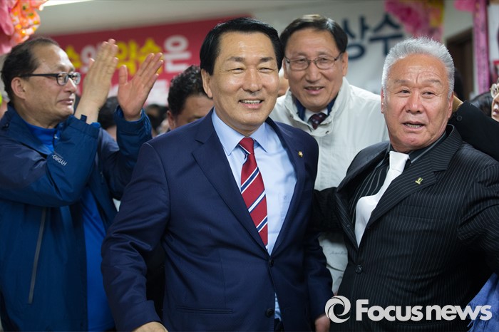 (인천=포커스뉴스) 제20대 국회의원선거 인천 중구동구강화군옹진군 선거구에서 당선이 확실시 된 안상수 무소속 후보가 13일 오후 인천 중구 선거사무소에 들어서고 있다.