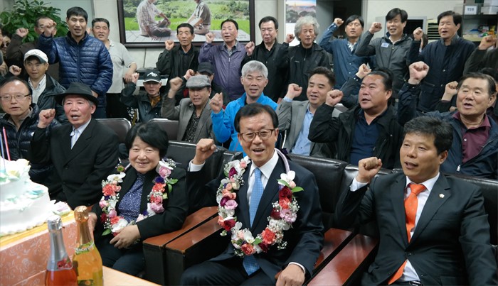 2위는 득표율 31.6%의 새누리당 안병도 후보가 차지했다.(서울=포커스뉴스) 20대 총선 당선이 확실시된 원혜영 더불어민주당 경기 부천오정구 후보와 부인 안정숙 씨가 13일 오후 경기도 부천 자신의 선거캠프에서 지지자들과 기뻐하고 있다. <사진제공=원혜영 후보 선거사무소> 2016.04.13 포커스포토