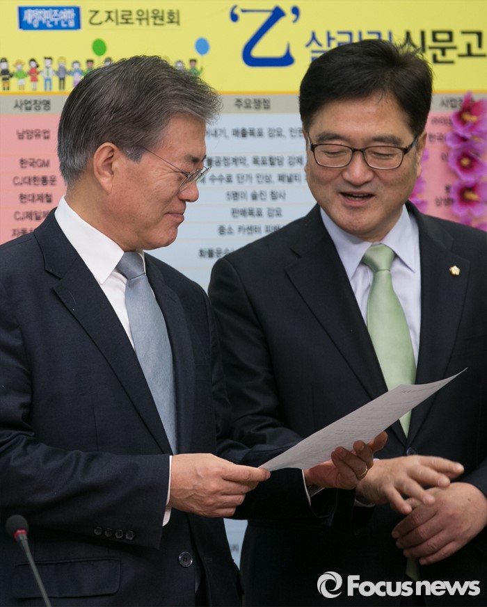 2위는 29.8%의 득표율을 기록한 새누리당 홍범식 후보였다.(서울=포커스뉴스) 문재인(왼쪽) 새정치민주연합 대표와 우원식 을지로위원장이 23일 오전 서울 여의도 국회에서 최고위원회의에 앞서 진행된 학교비정규직 처우개선 예산 확보 기념 상생꽃달기 행사에 참석해 자료를 살펴보고 있다. 2015.12.23 박동욱 기자