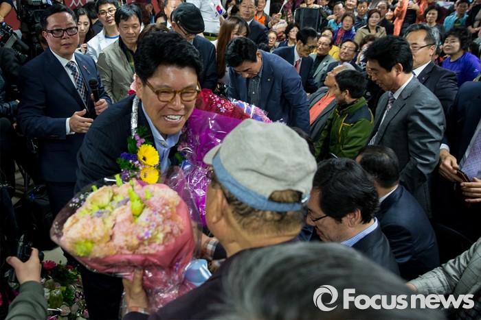 (부산=포커스뉴스) 제20대 국회의원선거에서 당선이 확실시된 장제원 무소속 부산 사상구 후보가 14일 오전 부산 사상구 선거사무소에서 지지자들과 기쁨을 나누고 있다.