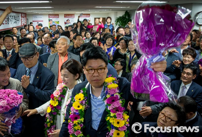 (부산=포커스뉴스) 제20대 국회의원선거에서 당선이 확실시된 장제원 무소속 부산 사상구 후보가 14일 오전 부산 사상구 선거사무소에서 꽃다발을 들고 있다.