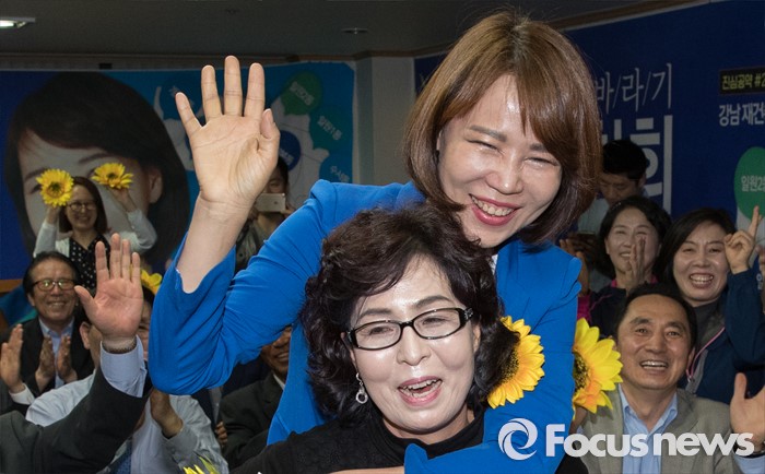 | △ 지지자들과 기뻐하는 전현희 더불어민주당 강남을 후보 |