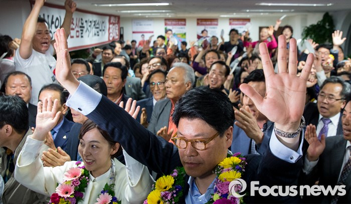 (부산=포커스뉴스) 제20대 국회의원선거에서 당선이 확실시된 장제원 무소속 부산 사상구 후보가 14일 오전 부산 사상구 선거사무소에서 두 손을 들어 기뻐하고 있다.