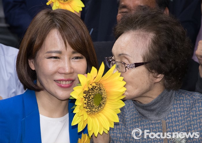 (서울=포커스뉴스) 2016 제20대 국회의원선거날인 13일 오후 서울 강남구 로즈데일빌딩에 위치한 전현희 더불어민주당 강남을 후보 선거사무소에서 전 후보가 어머니인 김명순 여사와 대화를 나누고 있다.
