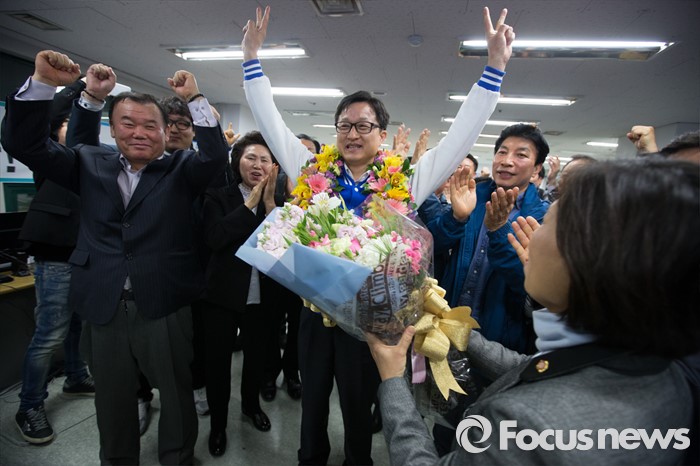 (서울=포커스뉴스) 강병원 더불어민주당 은평을 후보가 14일 오전 서울 은평구 선거사무소에서 당선이 유력시되자 지지자들과 함께 기쁨을 나누고 있다.