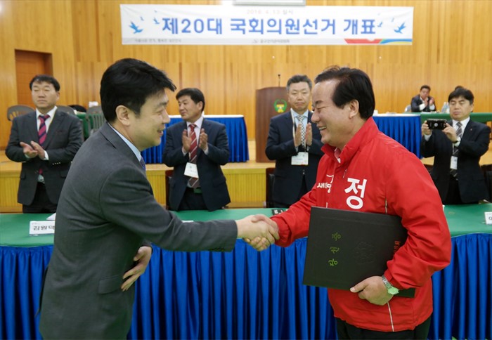 (서울=포커스뉴스) 20대 총선에서 당선이 확정된 정갑윤 새누리당 울산 중구 후보가 13일 울산의 한 개표소에서 당선증을 전달받고 있다. <사진제공=정갑윤 후보 선거사무소>