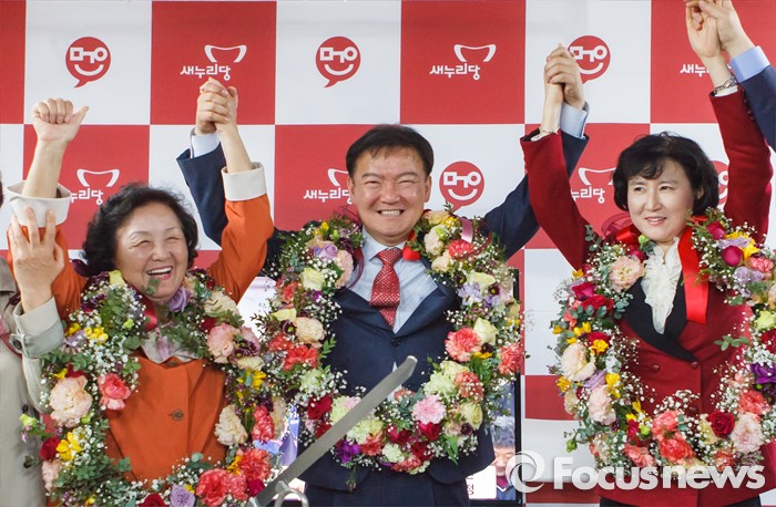 (서울=포커스뉴스) 20대 총선에서 당선이 확정된 민경욱 새누리당 인천 연수을 후보가 14일 인천 연수구 선거캠프에서 자축하고 있다. <사진제공=민경욱 후보 선거사무소>