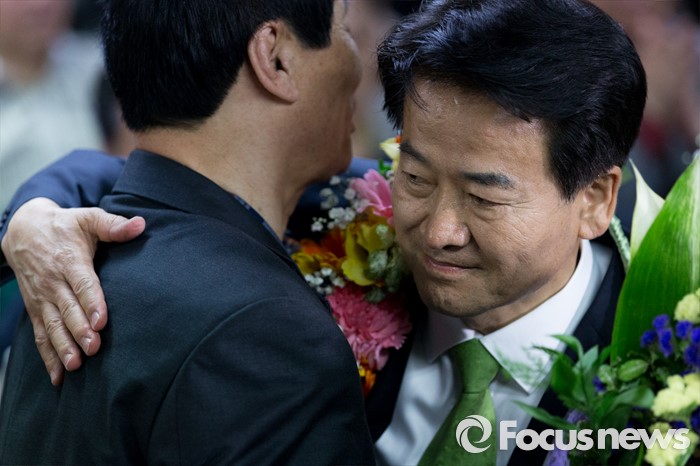 (전주=포커스뉴스) 정동영 국민의당 전주시병 당선인이 14일 오전 전북 전주시 금암동 선거사무소에서 당선이 확정되자 지지자들과 포옹을 하고 있다.
