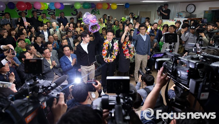 (전주=포커스뉴스) 정동영 국민의당 전주시병 당선인이 14일 오전 전북 전주시 금암동 선거사무소에서 당선이 확정되자 지지자들과 환호하고 있다.