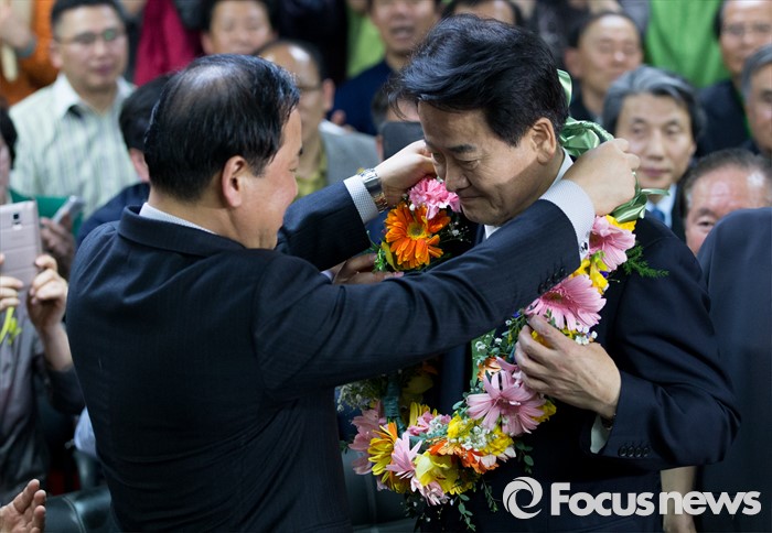 (전주=포커스뉴스) 정동영 국민의당 전주시병 당선인이 14일 오전 전북 전주시 금암동 선거사무소에서 당선이 확정되자 꽃목걸이를 목에 걸고 있다.