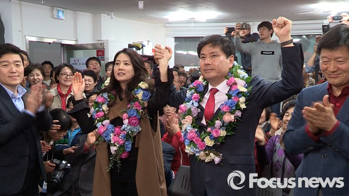 (서울=포커스뉴스) 20대 총선에서 당선이 확정된 지상욱 새누리당 중구성동을 후보가 14일 중구 신당동 선거사무소에서 부인 심은하 씨와 함께 기뻐하고 있다. <사진=포커스뉴스 영상캡쳐>