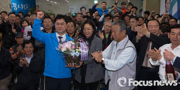 (논산=포커스뉴스) 제20대 충남 논산계룡금산 국회의원에 당선된 김종민 더불어민주당 당선인이 14일 논산 선거사무실에서 꽃바구니를 받고 있다.