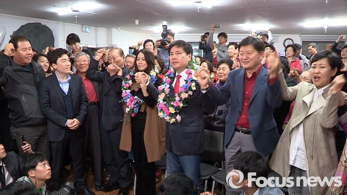 (서울=포커스뉴스) 20대 총선에서 당선이 확정된 지상욱 새누리당 중구성동을 후보가 14일 중구 신당동 선거사무소에서 부인 심은하 씨 등 지지자들과 함께 기뻐하고 있다. <사진=포커스뉴스 영상캡쳐>