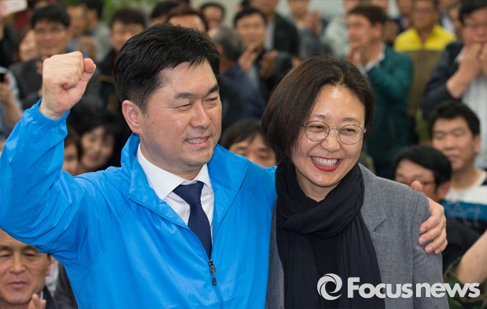 (논산=포커스뉴스) 제20대 충남 논산계룡금산 국회의원에 당선된 김종민 더불어민주당 당선인이 14일 논산 선거사무실에서 부인 홍윤정 여사와 포옹을 하며 파이팅을 하고 있다.
