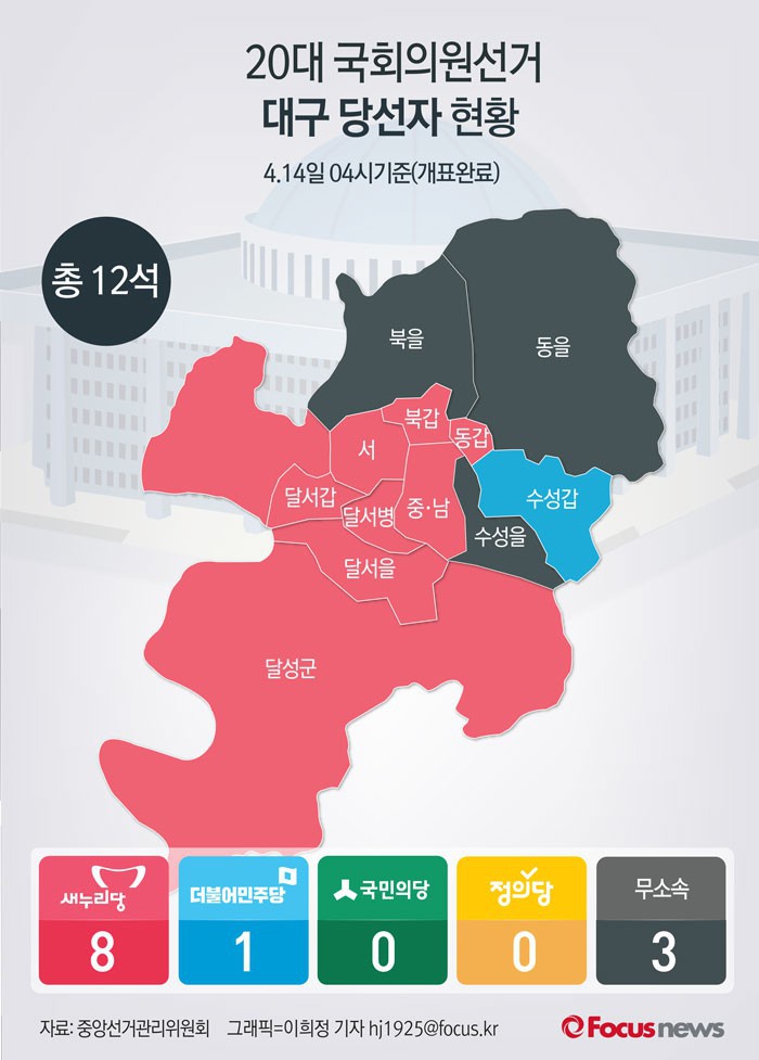 (서울=포커스뉴스) 20대 국회의원선거 개표결과 대구에서 새누리당은 8석, 무소속 3석, 더불어민주당이 1석을 차지했다.