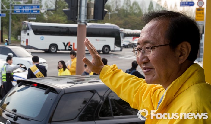(창원=포커스뉴스) 제20대 국회의원선거 경남 창원 성산구 국회의원에 당선된 노회찬 정의당 당선인이 14일 오전 창원시 위아사거리에서 출근길 시민들에게 당선인사를 하고 있다.