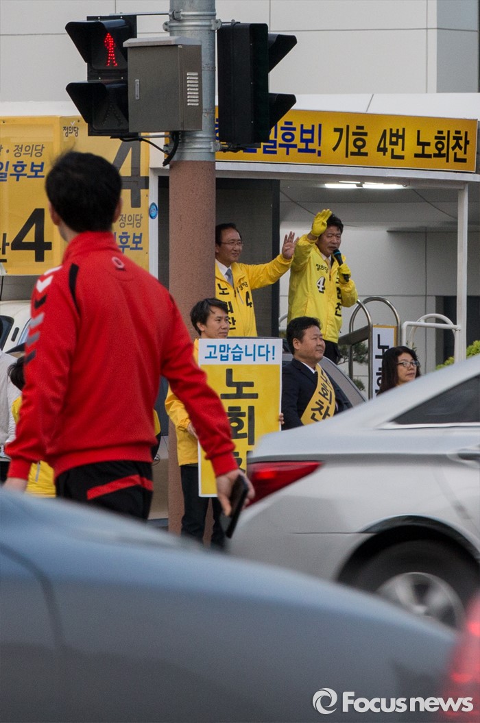 (창원=포커스뉴스) 제20대 국회의원선거 경남 창원 성산구 국회의원에 당선된 노회찬 정의당 당선인이 14일 오전 창원시 위아사거리에서 출근길 시민들에게 당선인사를 하고 있다.