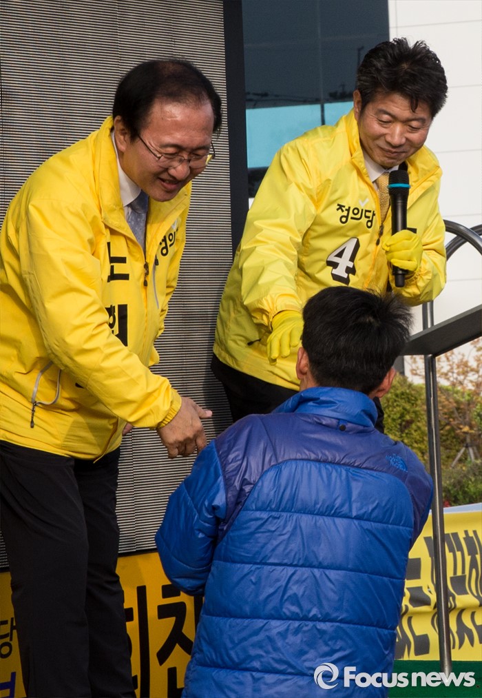 (창원=포커스뉴스) 제20대 국회의원선거 경남 창원 성산구 국회의원에 당선된 노회찬 정의당 당선인이 14일 오전 창원시 위아사거리에서 출근길 시민들에게 당선인사를 하고 있다.