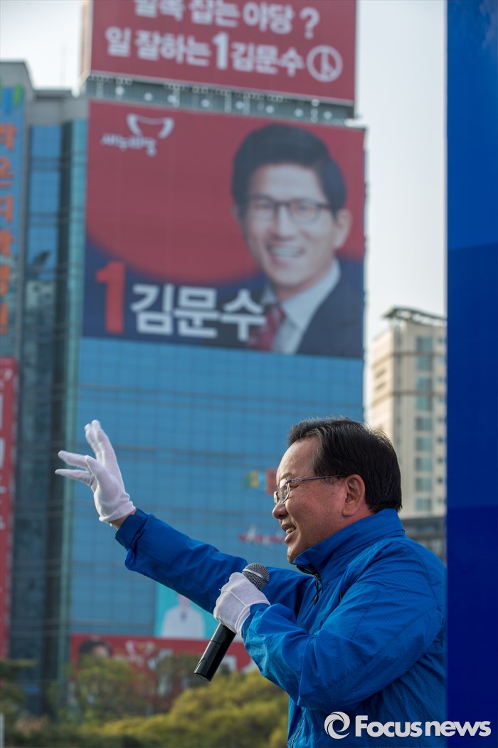 (대구=포커스뉴스) 제20대 국회의원선거 대구 수성구갑 선거구에서 당선된 더불어민주당 김부겸 당선자가 14일 오전 대구 수성구 범어네거리에서 당선 인사를 하고 있다.
