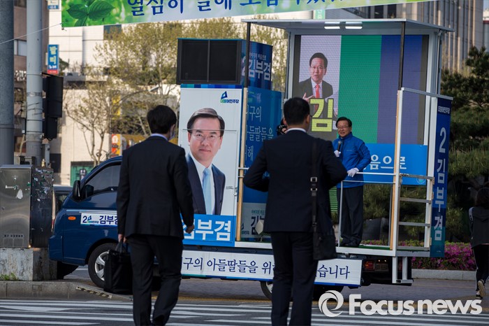 (대구=포커스뉴스) 제20대 국회의원선거 대구 수성구갑 선거구에서 당선된 더불어민주당 김부겸 당선자가 14일 오전 대구 수성구 범어네거리에서 당선 인사를 하고 있다.