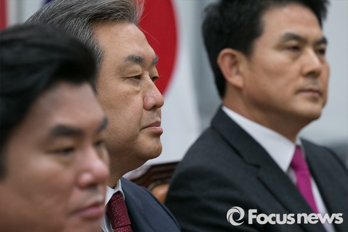 (서울=포커스뉴스) 김무성(가운데) 새누리당 대표와 원유철(왼쪽) 원내대표, 김태호 최고위원이 14일 오전 서울 여의도 국회에서 열린 중앙선대위 해단식에 참석해, 생각에 잠겨 있다. 이 자리에서 김 대표는 "선거 참패에 책임을 지고, 오늘부터 대표직을 사퇴한다"고 밝혔다.