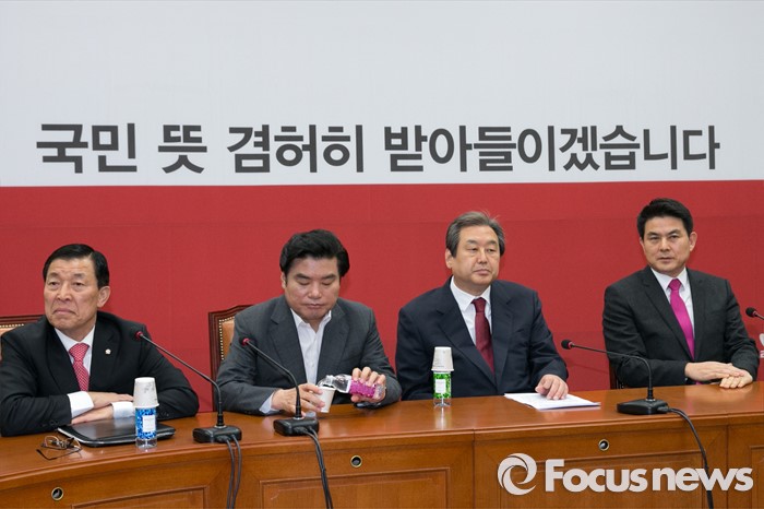 (서울=포커스뉴스) 새누리당 김태호(오른쪽부터 ) 최고위원, 김무성 대표, 원유철 원내대표, 황진하 사무총장이 14일 오전 서울 여의도 국회에서 열린 중앙선대위 해단식에 참석해, 생각에 잠겨 있다. 이 자리에서 김 대표는 "선거 참패에 책임을 지고, 오늘부터 대표직을 사퇴한다"고 밝혔다.