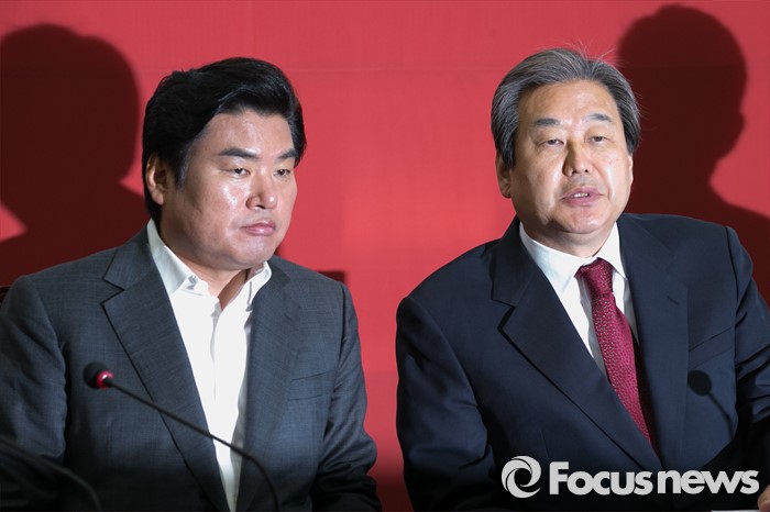 (서울=포커스뉴스) 김무성(오른쪽) 새누리당 대표와 원유철 원내대표가 14일 오전 서울 여의도 국회에서 열린 중앙선대위 해단식에 참석해, 대화하고 있다. 이 자리에서 김 대표는 "선거 참패에 책임을 지고, 오늘부터 대표직을 사퇴한다"고 밝혔다.