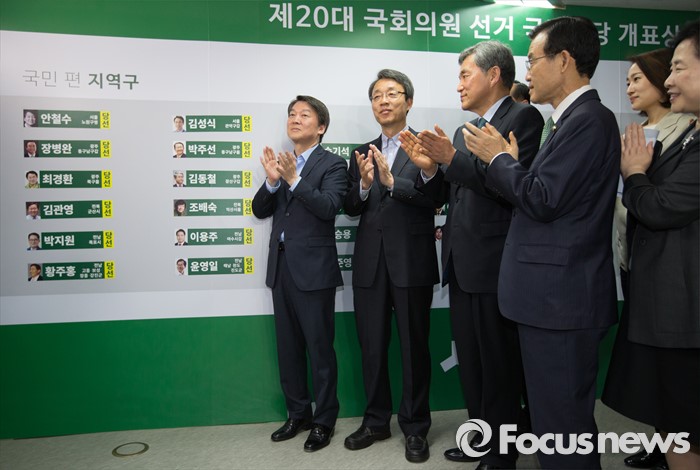 (서울=포커스뉴스) 안철수 국민의당 상임공동대표가 14일 오전 마포구 당사에서 선거 상황판에 당선된 후보들의 이름표를 붙이고 박수를 치고 있다. 왼쪽부터 안 대표, 김성식 관악구갑 국회의원 당선자, 이상돈 비례대표.
