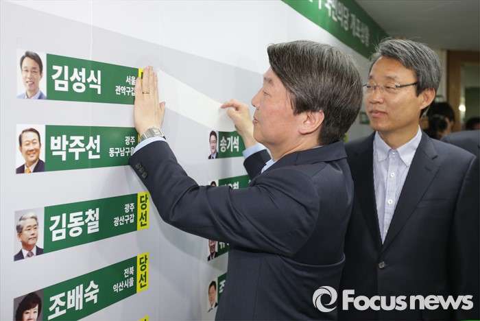 (서울=포커스뉴스) 안철수 국민의당 상임공동대표가 14일 오전 마포구 당사에서 선거 상황판에 당선된 후보들의 이름표를 붙이고있다.