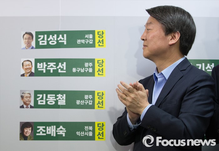 (서울=포커스뉴스) 안철수 국민의당 상임공동대표가 14일 오전 마포구 당사에서 선거 상황판에 당선된 후보들의 이름표를 붙이고 박수를 치고 있다.