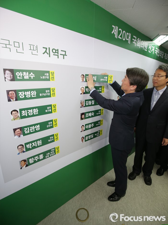 (서울=포커스뉴스) 안철수 국민의당 상임공동대표가 14일 오전 마포구 당사에서 선거 상황판에 당선된 후보들의 이름표를 붙이고있다.