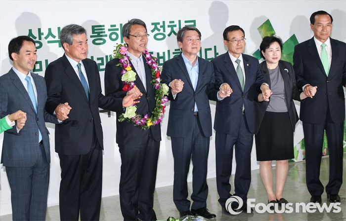 (서울=포커스뉴스) 안철수 국민의당 상임공동대표(왼쪽 네번째)와 지도부가 14일 오전 마포구 당사에서 김성식 관악구갑 국회의원 당선자(왼쪽 세번째)를 축하하며 손을 잡아 보이고 있다.