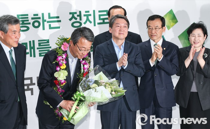(서울=포커스뉴스) 안철수 국민의당 상임공동대표(왼쪽 세번째)와 지도부가 14일 오전 마포구 당사에서 김성식 관악구갑 국회의원 당선자(왼쪽 두번째)를 축하하고 있다.