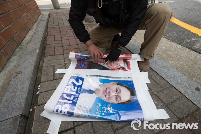 (서울=포커스뉴스) 제20대 국회의원 선거가 끝난 14일 오후 서울 서초구 일대에서 서초3동 주민센터 직원이 벽보를 철거하고 있다.