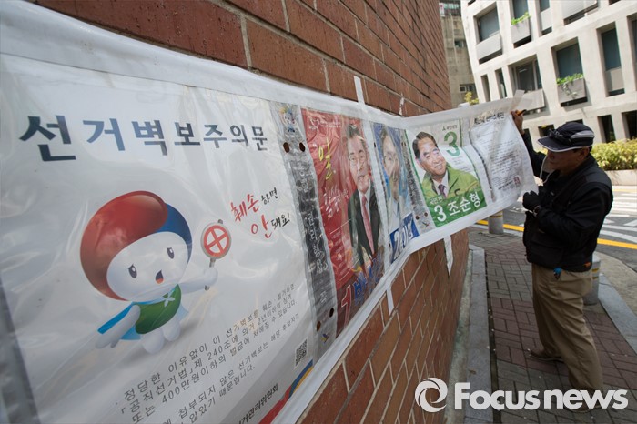 (서울=포커스뉴스) 제20대 국회의원 선거가 끝난 14일 오후 서울 서초구 일대에서 서초3동 주민센터 직원이 벽보를 철거하고 있다.
