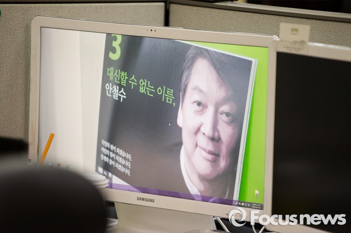 (서울=포커스뉴스) 안철수 국민의당 상임공동 대표가 14일 오전 서울 마포구 국민의당 당사에서 선거대책회의를 하고 있는 가운데 한 당직자의 자리의 모니터에 안 대표의 얼굴 이미지와 함께 '대신할 수 없는 이름, 안철수'라는 글이 보이고 있다.