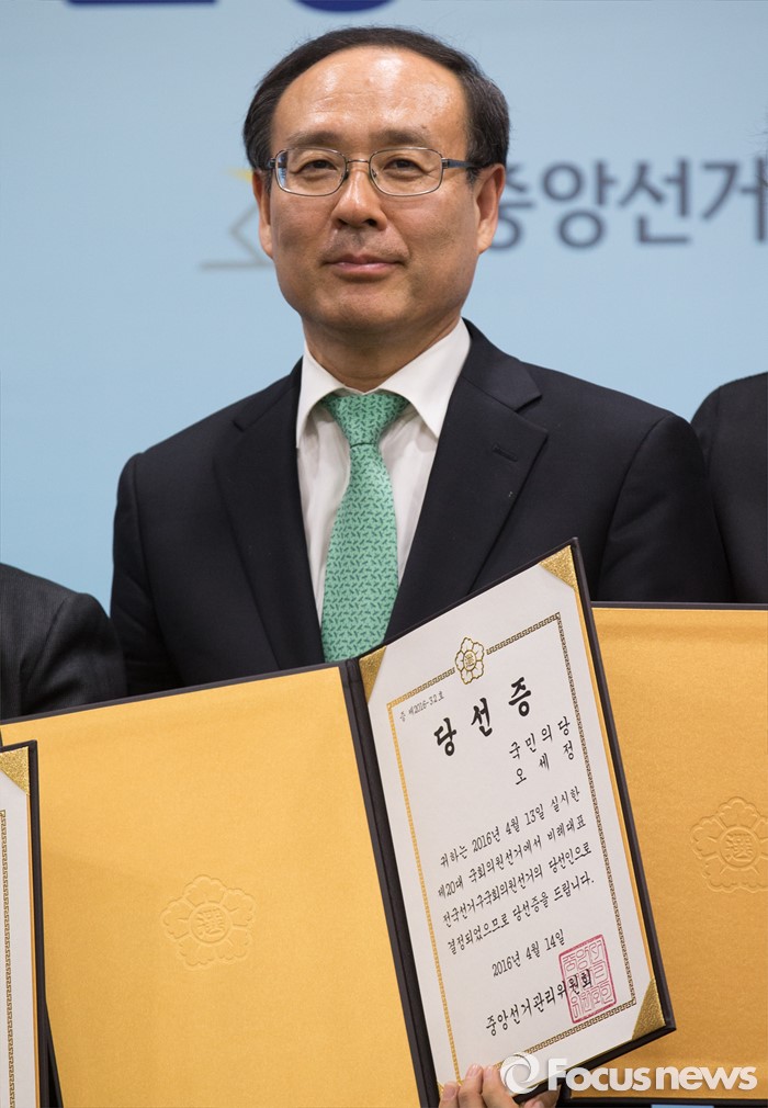(과천=포커스뉴스) 14일 오후 경기도 과천 중앙선거관리위원회 회의실에서 열린 제20대 국회의원선거 비례대표국회의원 당선증 교부식에 참석한 오세정 국민의당 당선인이 기념촬영 하고 있다.