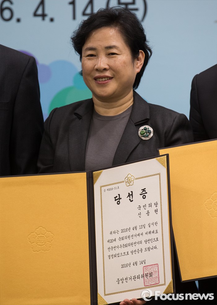 (과천=포커스뉴스) 14일 오후 경기도 과천 중앙선거관리위원회 회의실에서 열린 제20대 국회의원선거 비례대표국회의원 당선증 교부식에 참석한 신용현 국민의당 당선인이 기념촬영 하고 있다.