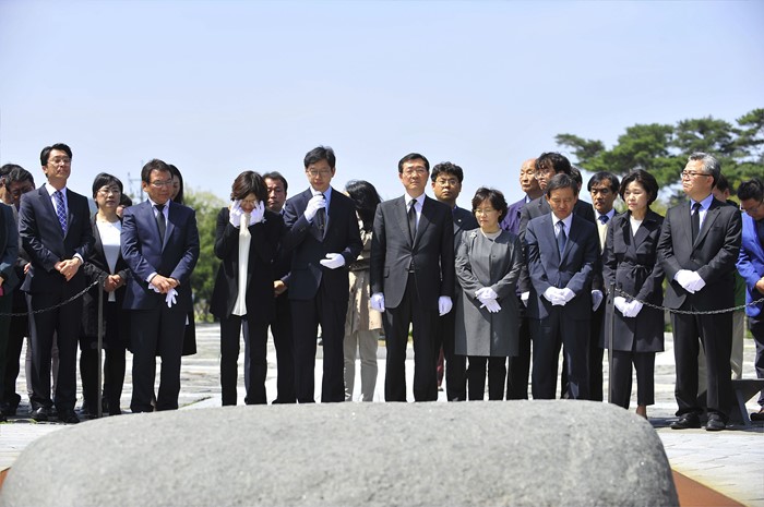 (서울=포커스뉴스) 20대 총선 경남 김해을 선거구에서 당선된 김경수(앞줄 왼쪽 네번째) 더불어민주당 당선인이 14일 오후 경남 김해 봉하마을을 방문한 노무현 전 대통령의 묘지인 너럭바위 참배 후 인사말을 하고 있다. 앞줄 왼쪽 다섯번째는 민홍철 더민주 경남 김해갑 당선인.