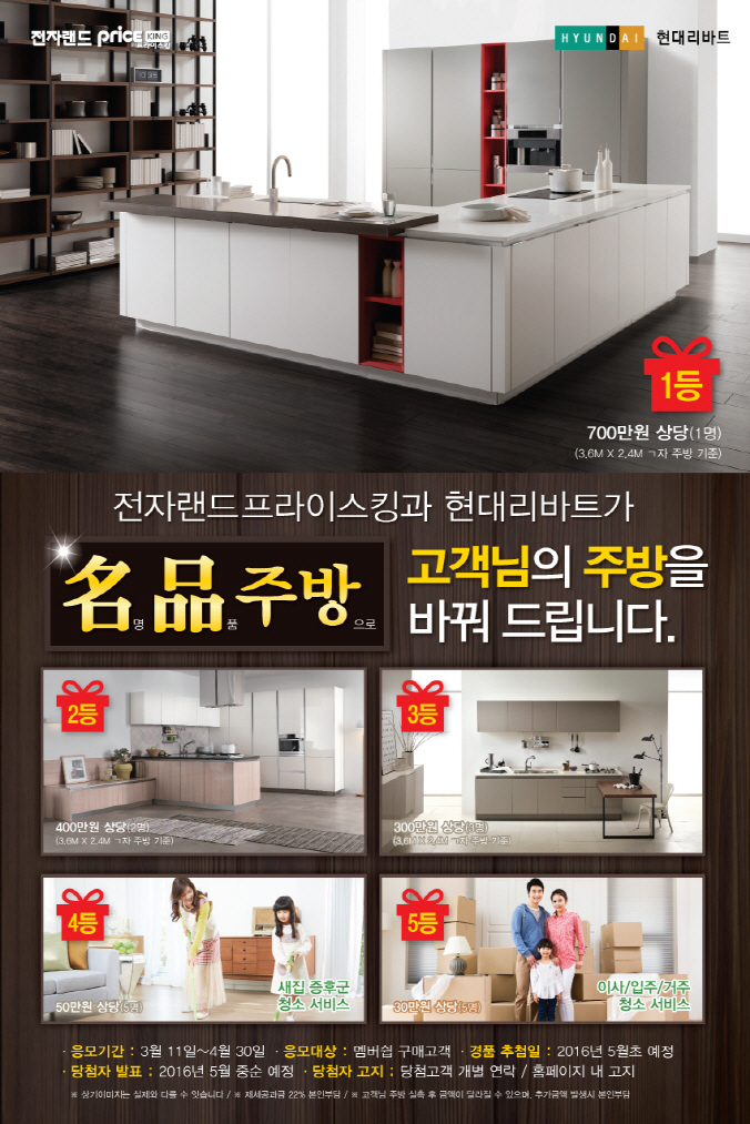 행사 참여는 멤버십 회원 중 제품 구매자에게 제공하는 응모권으로 할 수 있다. 추첨을 통해 1등 1명에게 700만원, 2등 2명은 400만원, 3등 3명 300만원 상당의 주방 인테리어 제품을 지급한다. 4등과 5등 각 5명에게는 새집증후군 청소 서비스와 입주 청소 서비스가 제공된다.