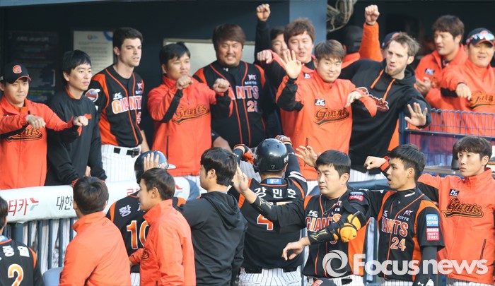 (서울=포커스뉴스) 14일 서울 잠실구장에서 열린 2016 프로야구 롯데-LG 경기 1회초 2사 1루에서 롯데 강민호가 좌월 2점 홈런을 치고 덕아웃에서 동료들과 세리머니를 하고 있다.