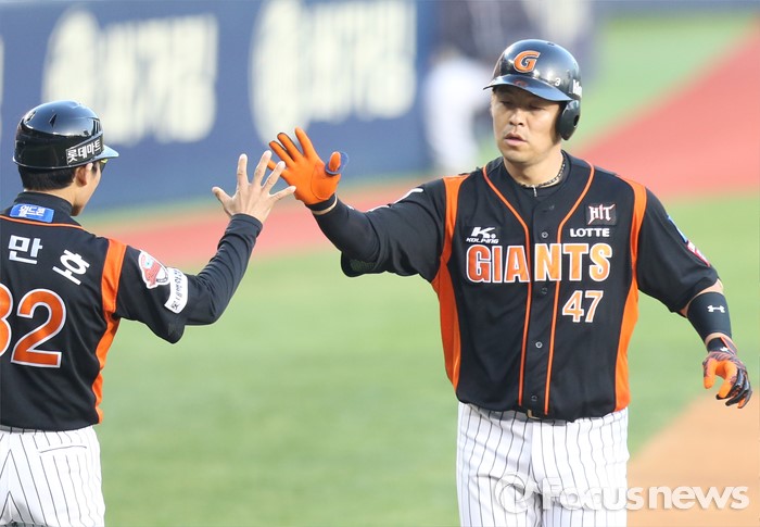 (서울=포커스뉴스) 14일 서울 잠실구장에서 열린 2016 프로야구 롯데-LG 경기 1회초 2사 1루에서 롯데 강민호가 좌월 2점 홈런을 치고 3루를 돌며 최만호 코치와 하이파이브를 하고 있다.