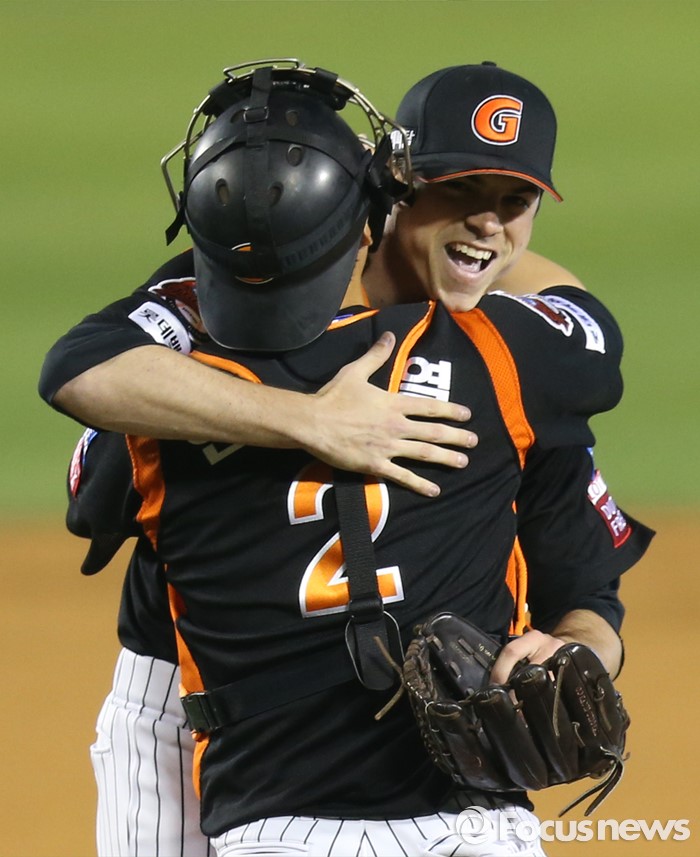 (서울=포커스뉴스) 14일 서울 잠실구장에서 열린 2016 프로야구 롯데-LG 경기에서 롯데 투수 레일리가 10탈삼진 무사사구 완봉승 거두고 포수 안중열과 포옹하고 있다.