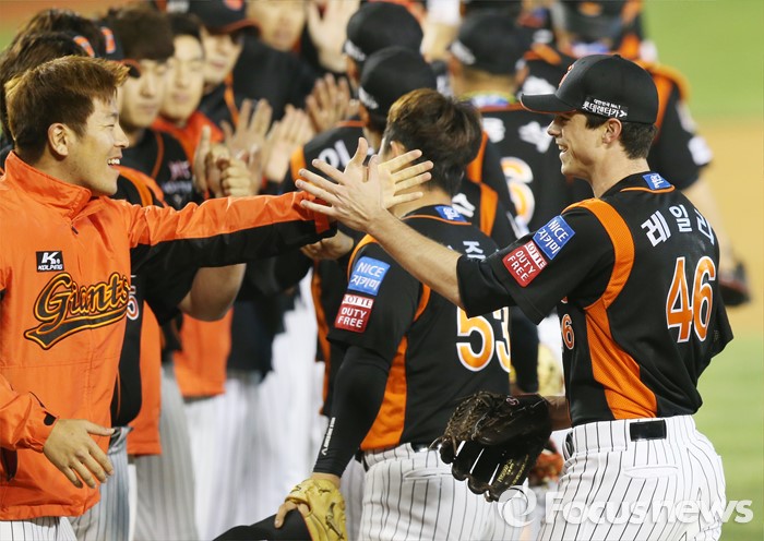 (서울=포커스뉴스) 14일 서울 잠실구장에서 열린 2016 프로야구 롯데-LG 경기에서 롯데 투수 레일리가 10탈삼진 무사사구 완봉승 거두고 주장 강민호의 축하를 받고 있다.